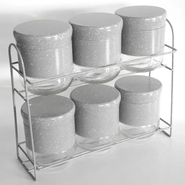 Gray 6pcs Set Stainless Steel Cover Glass Spices Jar Rack Food Storage Glass Jar Kitchen Spice Rack